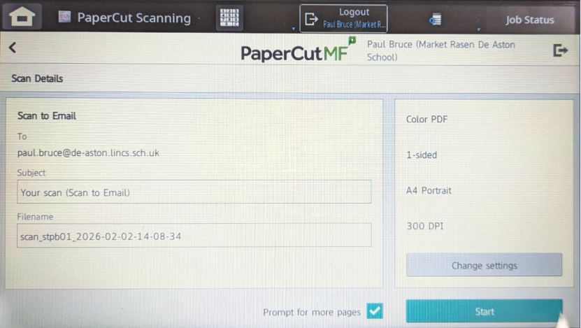 As this “how to” is about “scan to email”, the last screen is where you press start.